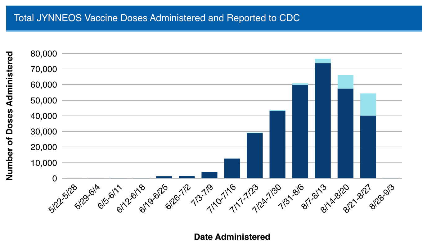 Demand for the vaccine may also be slowing. For the 30 jurisdictions that have reported data on vaccine administration, the number of first doses given has dropped week over week since August 7. Usually, that would reflect a decline in demand, but this was around the time when the administration switched to a dose-sparing strategy that relies on intradermal administration (though not all jurisdictions made the switch right away) which makes the trend a bit difficult to interpret. Did everyone who wants the vaccine or has ready access already receive one, or are there challenges related to demand or administration of intradermal? I hope it’s the former, but it would be good to better understand what’s happening on the ground.