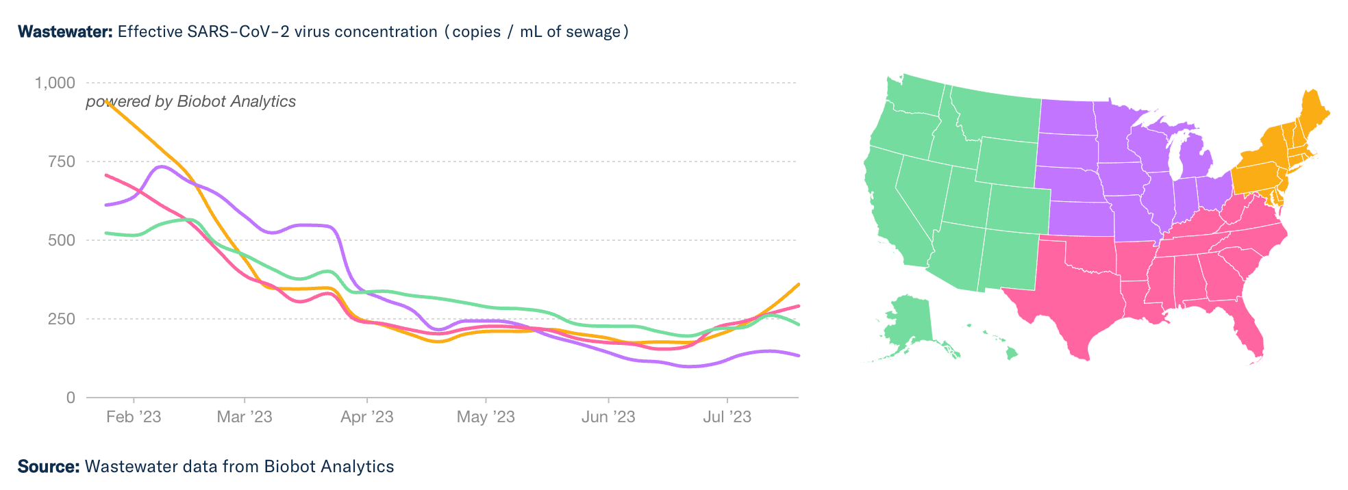 Covid-19 activity continued to pick up again this week. In both the Northeast and Southern regions of the country, there was an increase in the concentration of SARS-CoV-2 in wastewater. For comparison, these levels are similar to what we saw in March and April.
