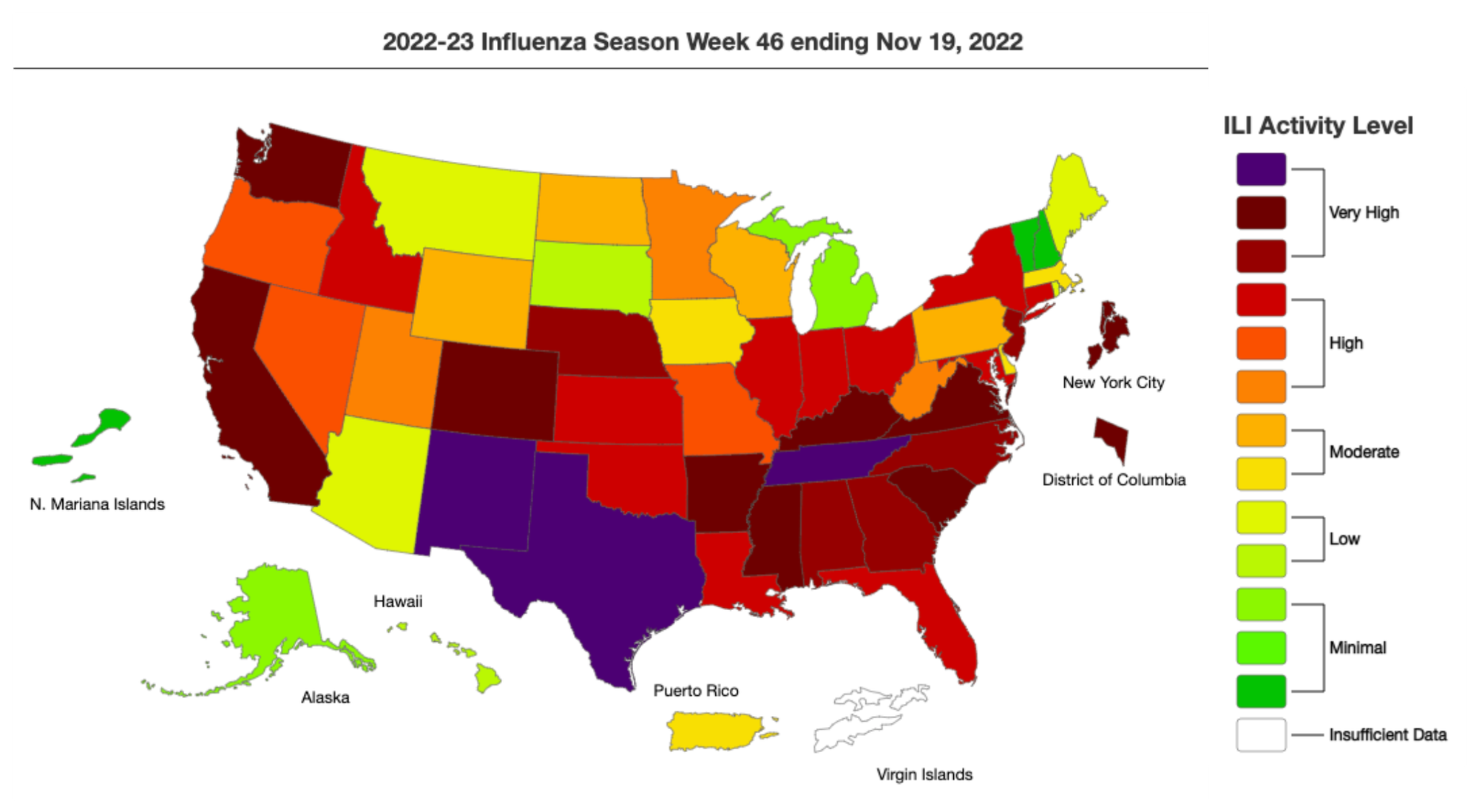 As expected, the whole country is now in the thick of flu season, with 35 jurisdictions reporting high or very high levels of ILI activity.