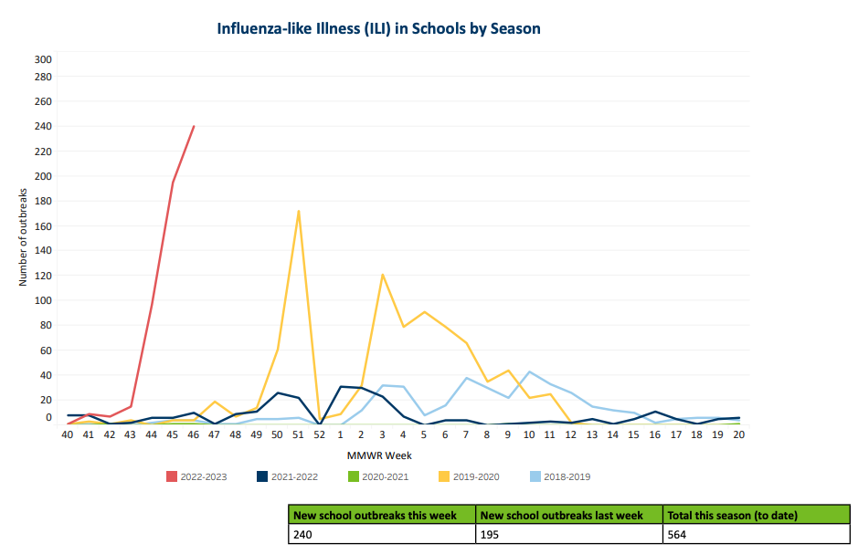 I was struck by this graph of ILI outbreaks in Minnesota schools. Over 560 schools have registered an outbreak during this school year, far more than in previous seasons. I would like to see this reported from more jurisdictions because it gives a more concrete picture of the impact of outbreaks on schools and workplaces than other indicators. Ventilation, filtration, masking and hand washing can help to keep kids healthy and in school during flu season.