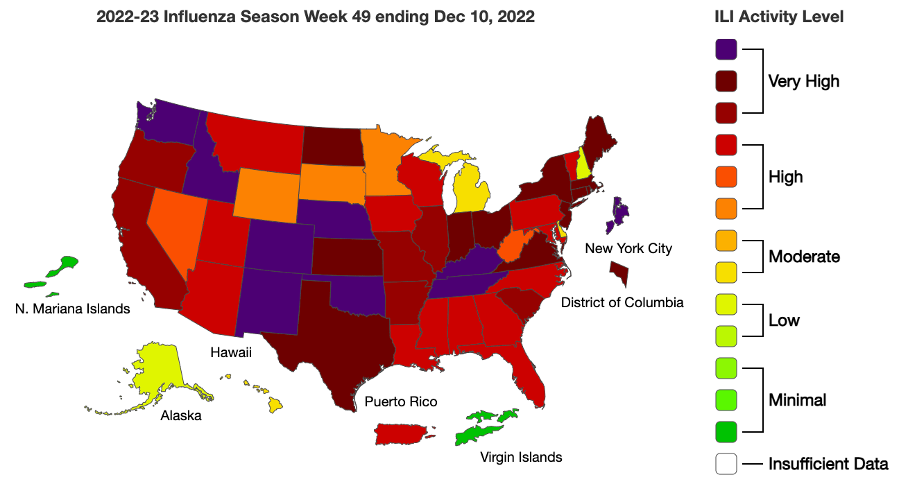 Most of the country (48 jurisdictions) is reporting high or very high levels of ILI activity. I see modest improvements in the southeastern and Appalachian regions where the flu season started especially early. Still, in a normal year, the flu activity in these regions would be considered quite high, so it’s not time to relax.