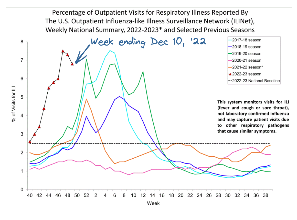 This time last year, I was bracing for the impending omicron wave. Although vaccines had been widely available for most of a year, the wave turned out to be the worst yet, with a peak of 160,000 hospitalizations. While the pandemic has improved in the current year, there are a lot of viruses circulating this holiday season, making it the third consecutive year with unusual disease activity.
