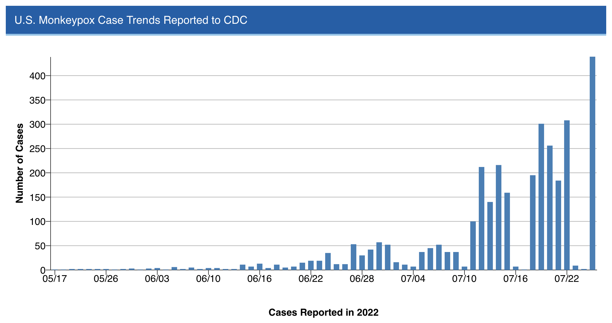 Today the Centers for Disease Control and Prevention published an epidemic curve (also called an epicurve) of the daily number of monkeypox cases reported to the agency. Previously, only counts for the current day were available, making it difficult to track trends over time.