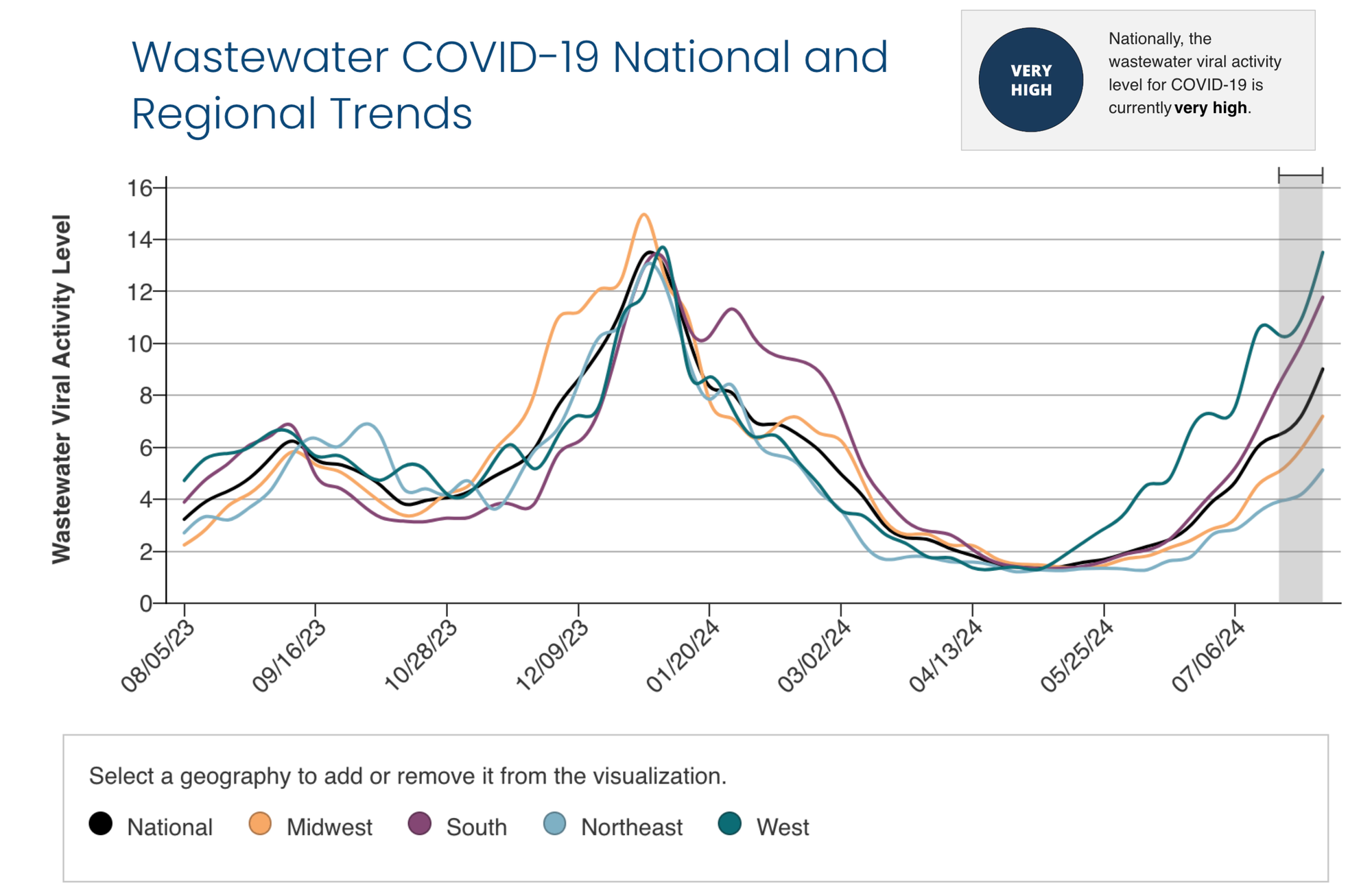 This wave has gone on much longer than I would have guessed. This summer season is proving to be quite tenacious. Wastewater levels are very high nationally, and increased across all regions this past week.