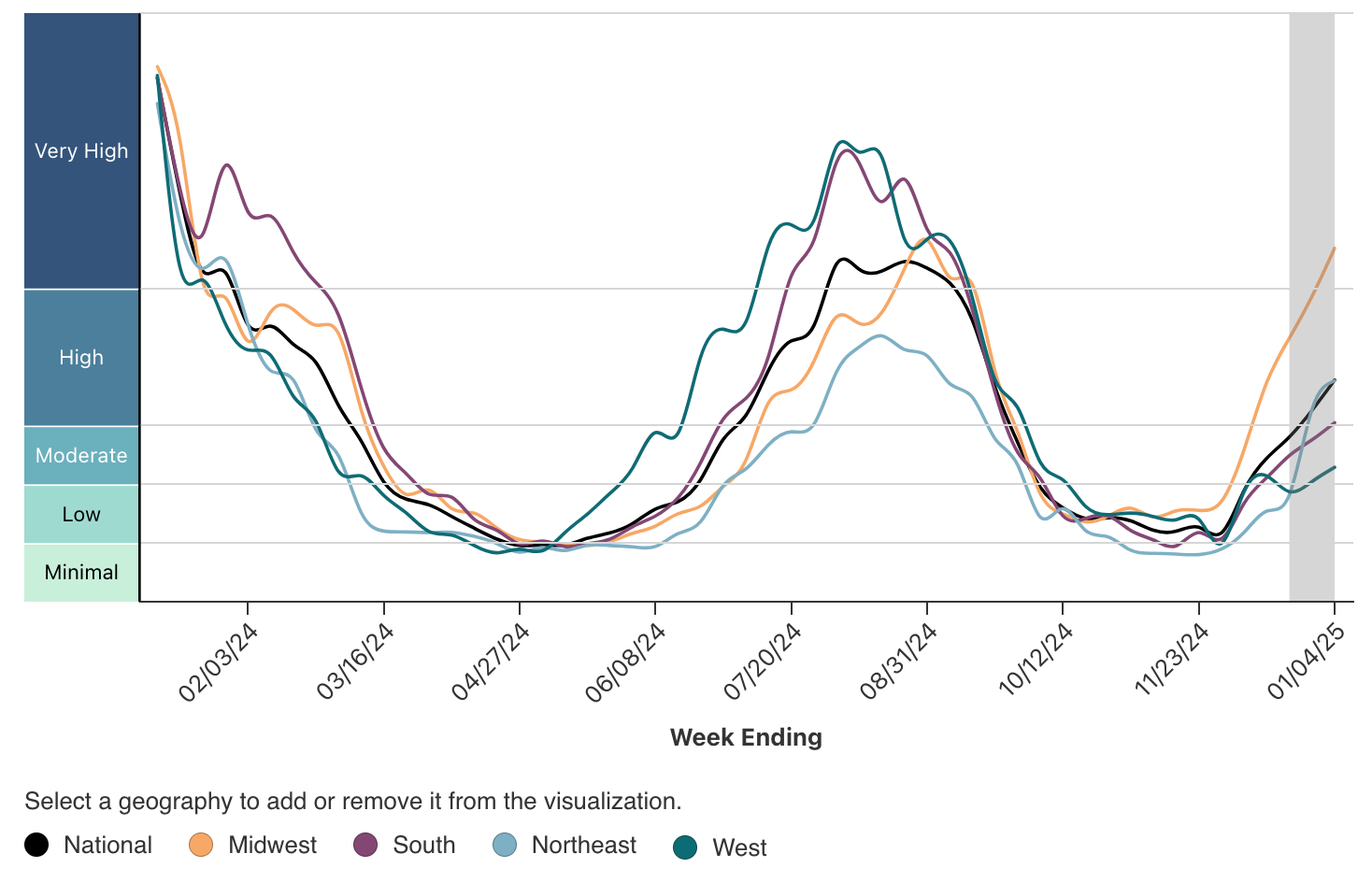 I’m seeing really mixed indicators when it comes to Covid-19. For example, emergency department visits and test positivity are down, but wastewater concentration is still rising in all four areas of the country. For now, I think it’s best to assume that there is still plenty of SARS-CoV-2 circulating. I’ll check in with more details next week.