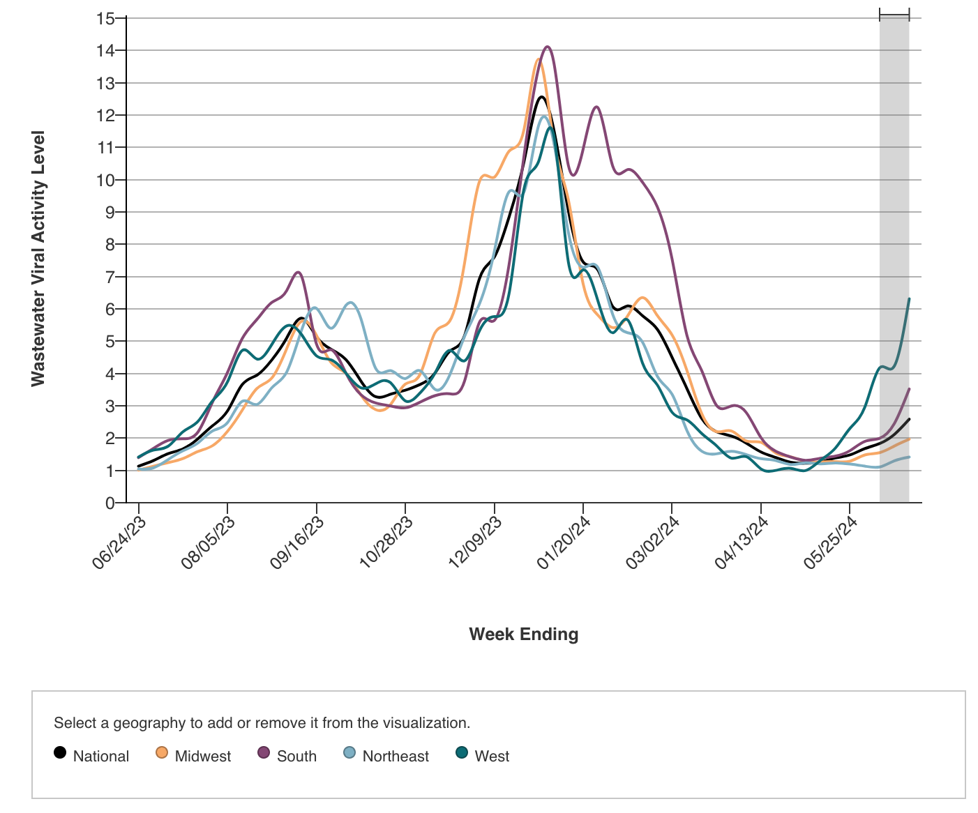 Covid-19 activity remains low but continues to pick up, particularly in the West. Wastewater data shows yet another sizable increase at the national level; levels are now more than double where they were in May. Test positivity has also more than doubled in that time frame.