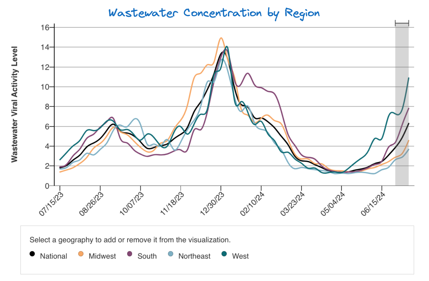 The summer wave of infections is here. National wastewater concentrations have risen sharply, matching last summer's peak levels.