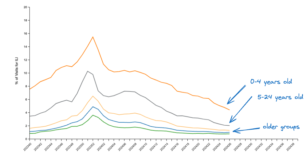 Even that 0-4 age group, which tends to continue to have higher levels of spread even during the summer, is reporting relatively low levels of outpatient visits for ILI (4.4%).