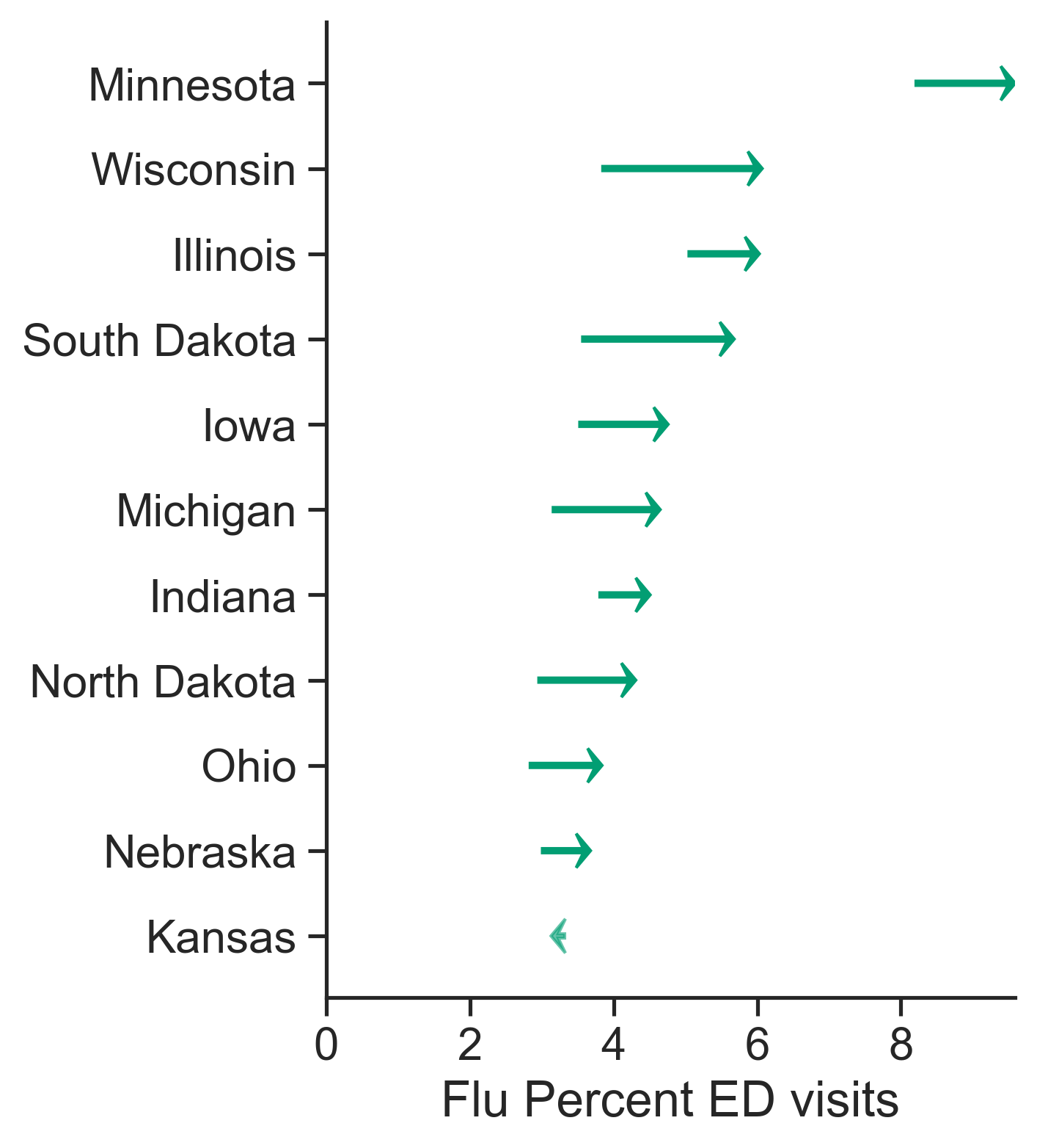 At the national level, flu defied my expectations by re-surging after two consecutive weeks of improvement. Unfortunately, the Midwest is one of the regions seeing more increases in activity. There is a distinct north-to-south gradient, with Minnesota and Wisconsin experiencing high activity. ED visits are also increasing in nearly all areas, suggesting we are still in the thick of flu season.
