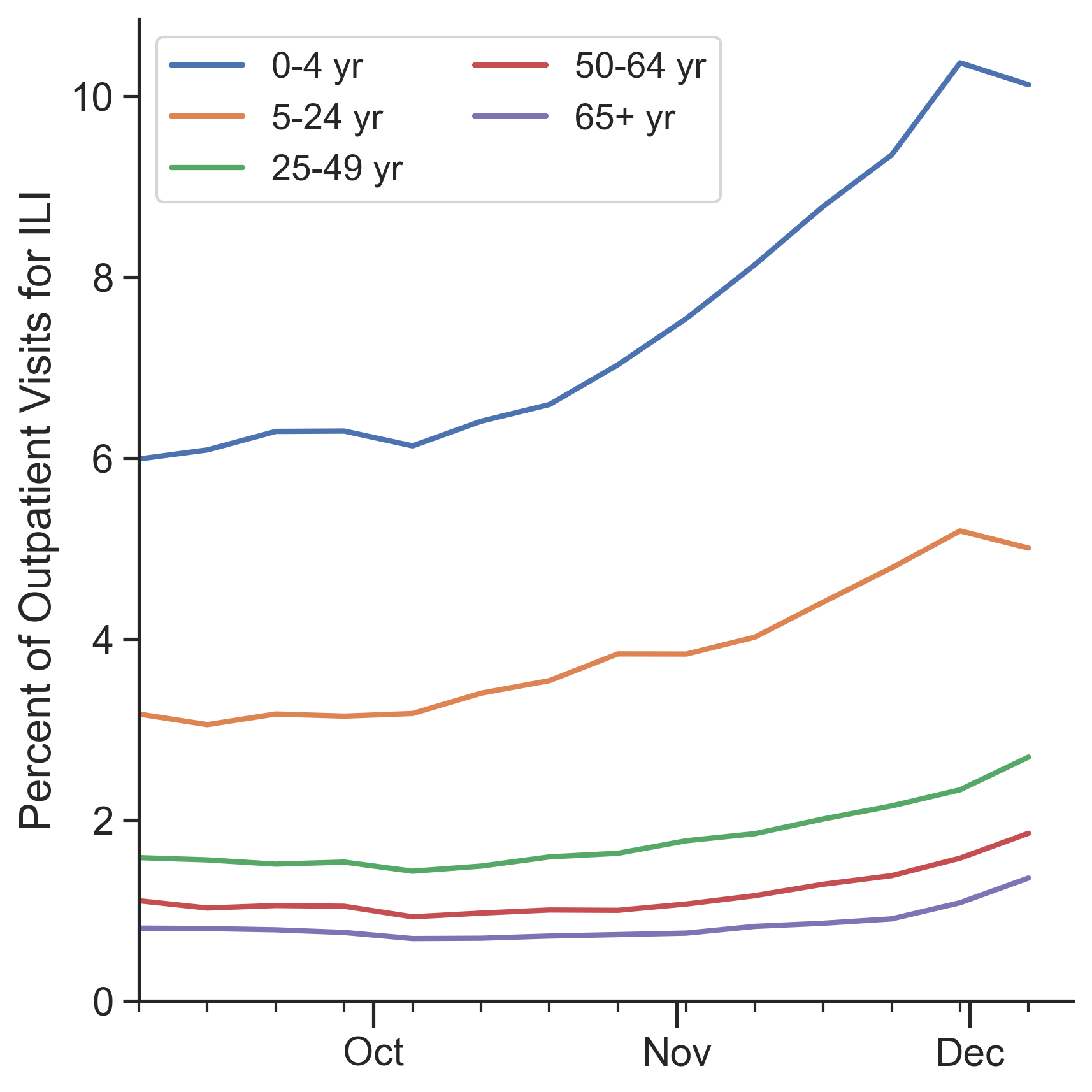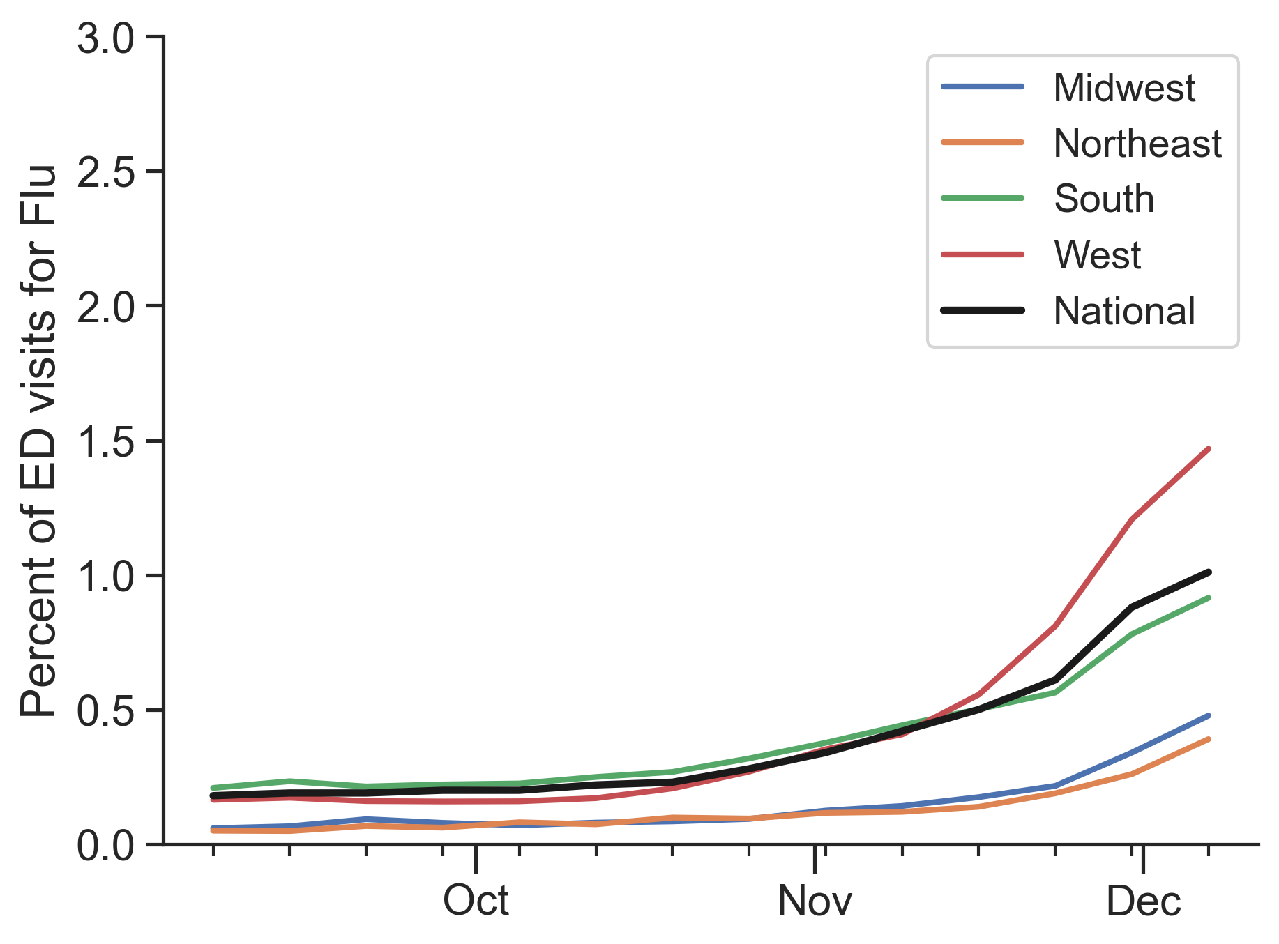 Outpatient influenza-like illness increased this week from 3.2% to 3.4% visits to the doctor for fever and cough or sore throat. To give you a sense of where we might be headed, previous years have seen peaks between 4.9% and 7.4%, often around the turn of the new year. Emergency department visits for influenza like illness are increasing as well, now constituting around 1% of visits. Peak season can hit double digits.