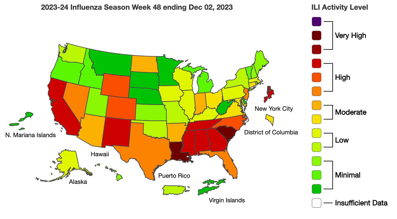 By region: ILI activity remains most intense overall in Southern states, but the whole country is seeing increases. Louisiana and South Carolina currently have "very high" levels of activity. Fourteen states across the country are in the “high” category, including New York City and California. The Midwest and Northeast remain mostly in the “low” categories, but I expect that to change in the weeks to come.