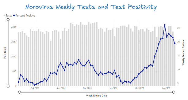 Working-age adults (25-49 years) are seeing more moderate activity at 6.5% (this is still high!), while older adults show progressively lower rates, with those 50-64 years at 4.9% and those 65 and older at 3.2%. All age groups are seeing increases.