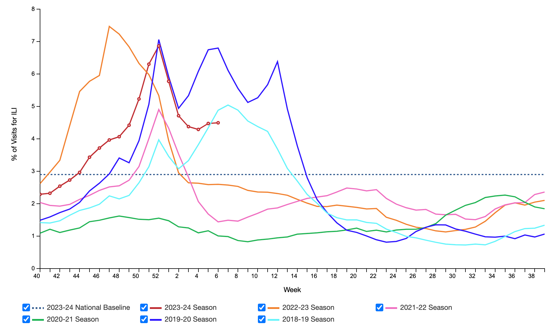 Influenza-like illness remained about the same this week, with 4.7% of visits to the doctor for fever and cough or sore throat. This is above the baseline of 2.9% that marks flu season. Current activity is a mix of influenza A, which is more common in the winter months, and influenza B, which is more often associated with springtime.