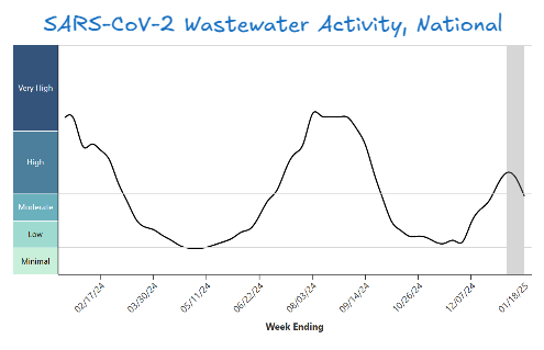 Wastewater activity has declined to moderate levels after three weeks at high levels nationally. If activity continues to decline, this will have a been a much smaller peak in activity than during either of the other two peaks in the past year (late summer and last winter).
