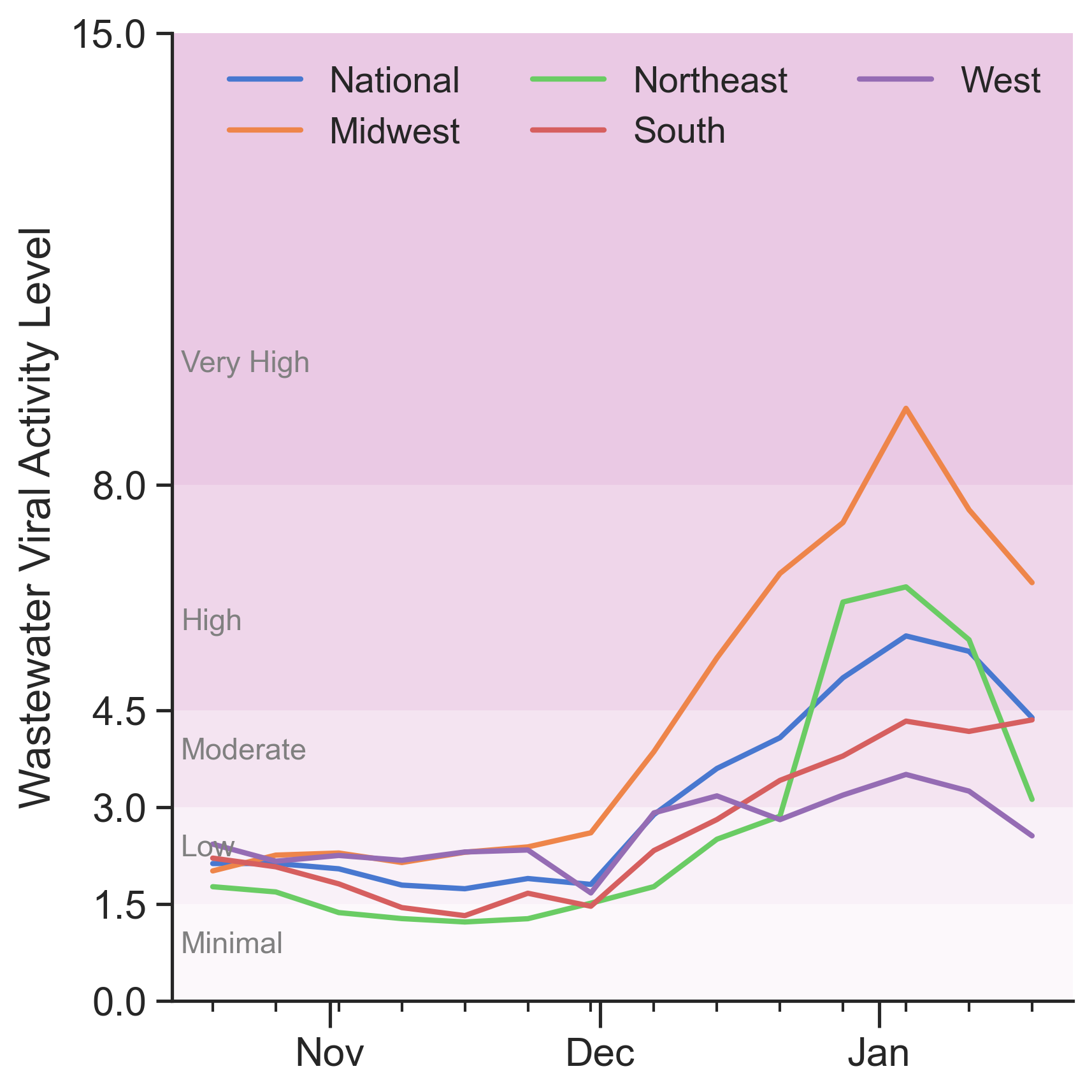 For now, the Midwest continues to lead the country in wastewater activity, though activity has declined there for two weeks in a row, down from very high to high activity.