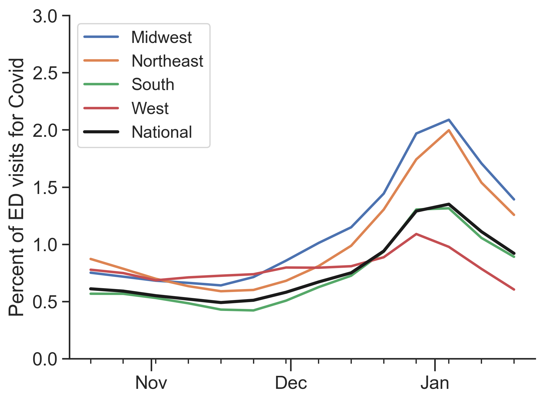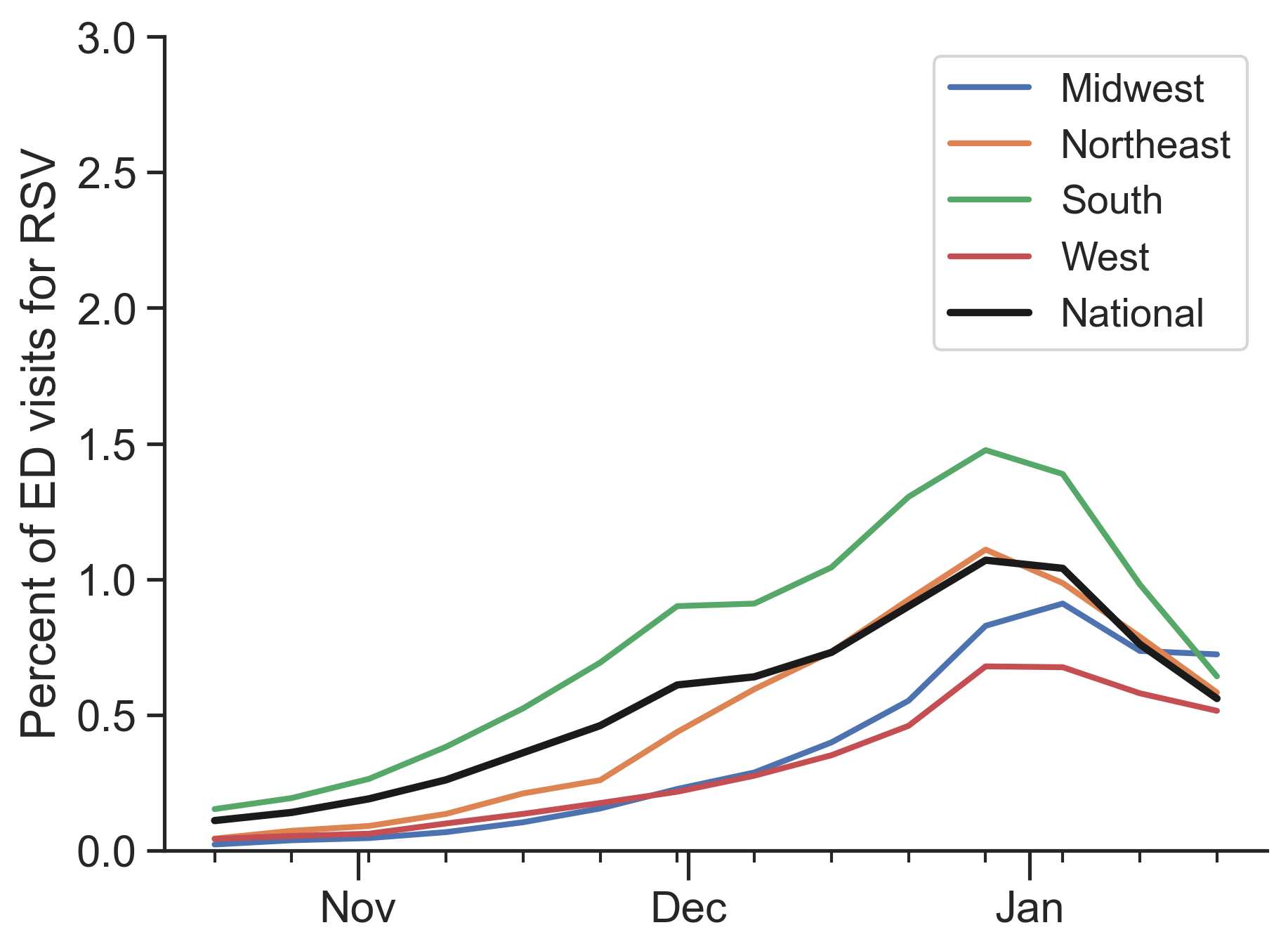 We appear to be heading out of RSV season, with all four regions of the country seeing declines in emergency department visits for RSV. However, activity is still elevated compared to the off season. I recommend continued caution if you have infants or older adults in your life.