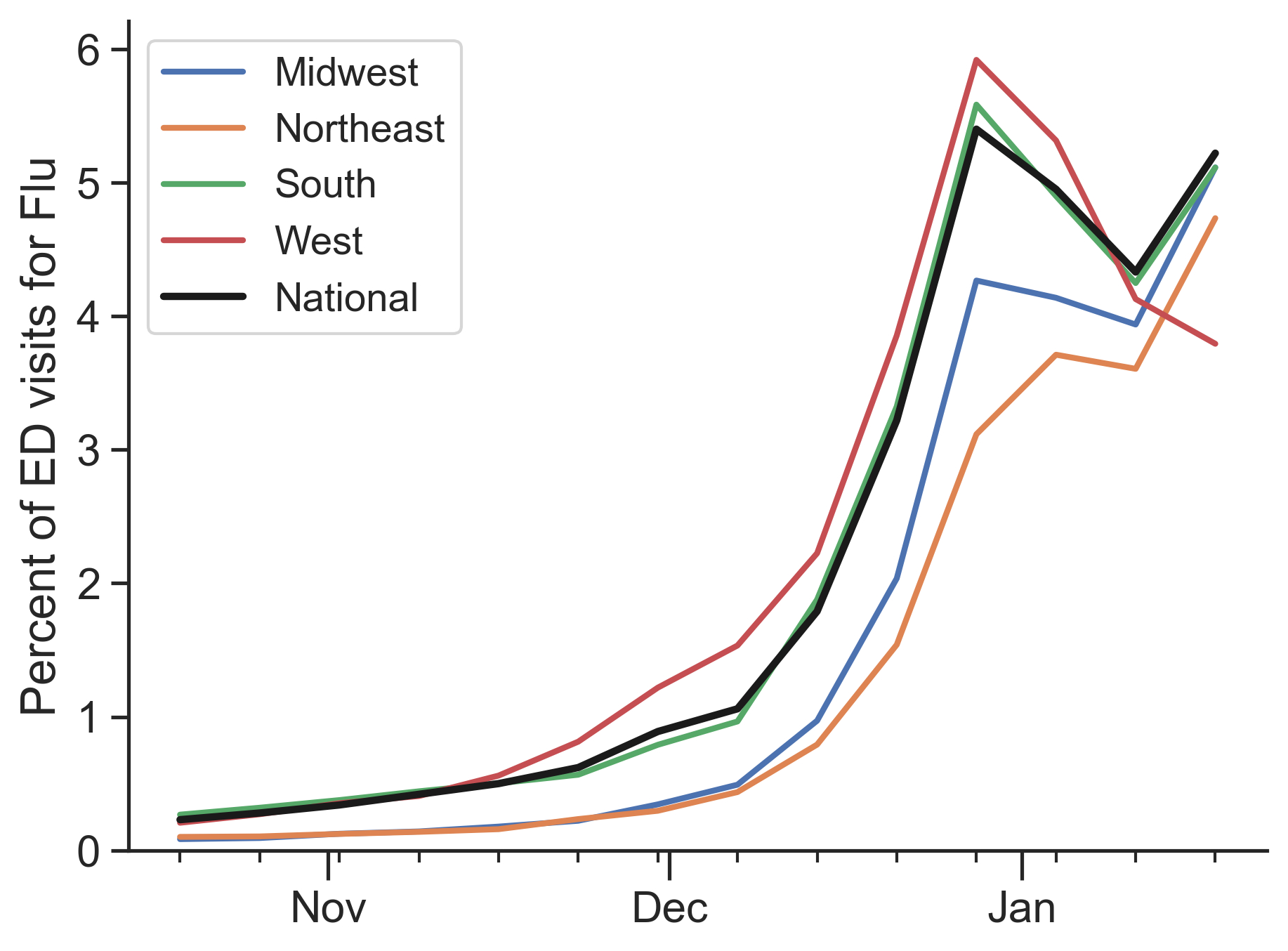 The South and Midwest are most heavily affected, but all four regions of the country continue to see substantial flu activity. Emergency department visits, for example, have resumed increasing in the South, Midwest and Northeast. Only the Western region is seeing continued decline in that metric.