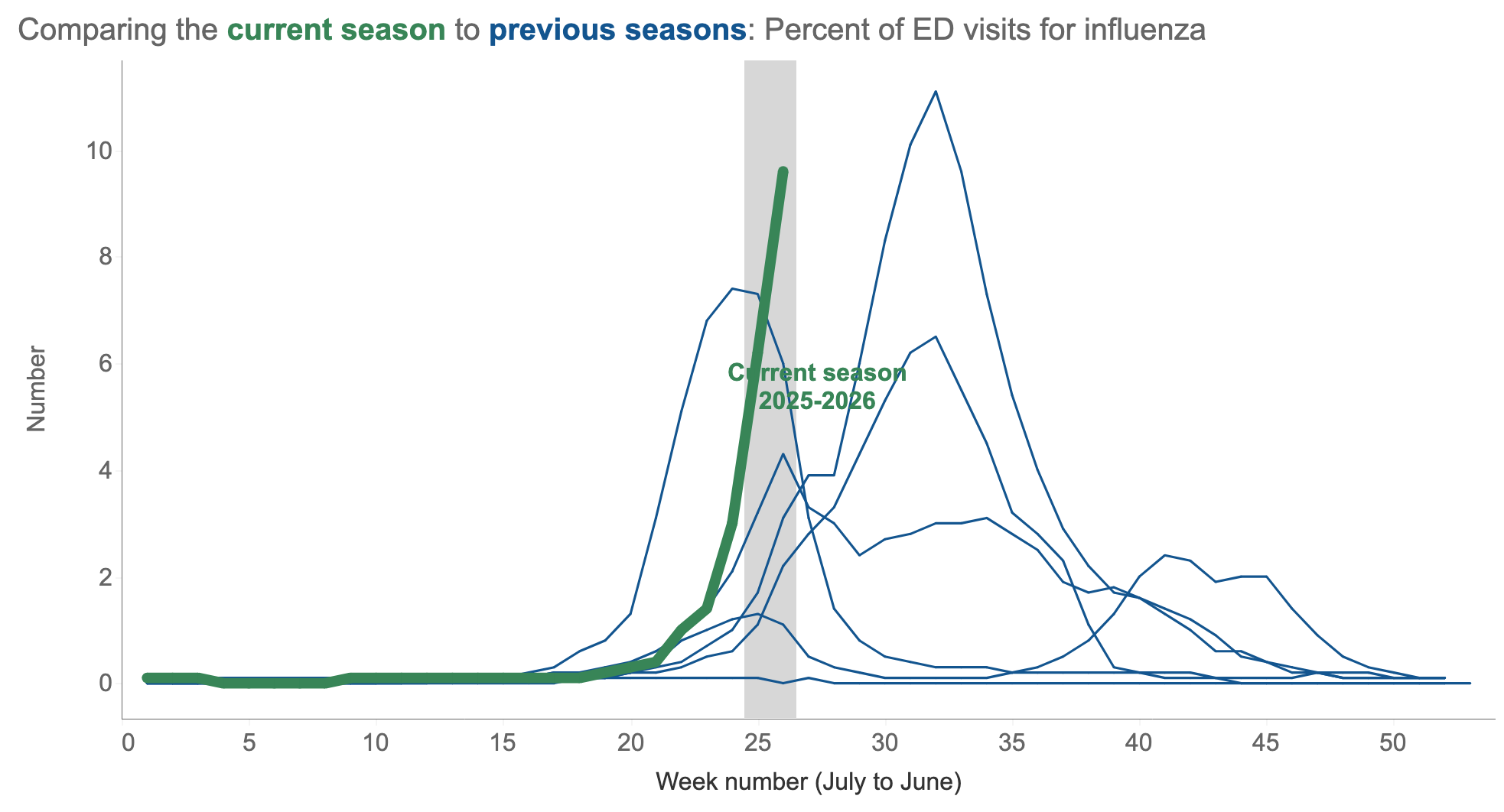 Hawaii may have passed its peak — test positivity and ED visits both declined this week. However, rates are still very high: flu accounted for 8.5% of ED visits, and hospitalizations continue to climb (6.2% of all admissions).