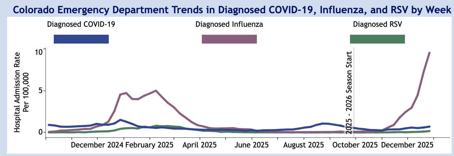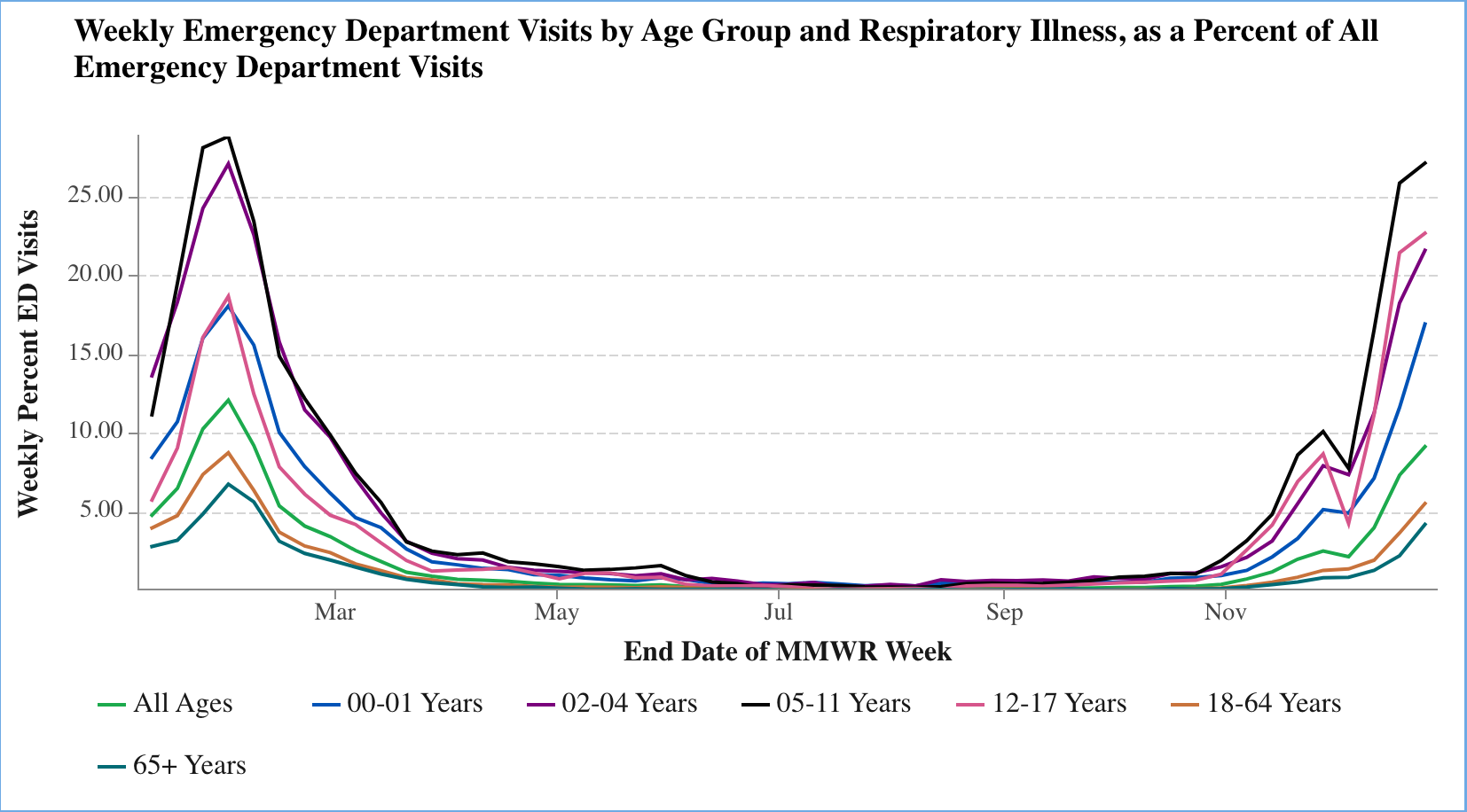 RSV continues to slowly rise in Colorado (~0.2% of ED visits), Kansas (0.2% of ED visits), New York City (~0.4% ED visits), and Pennsylvania (0.4% of ED visits).