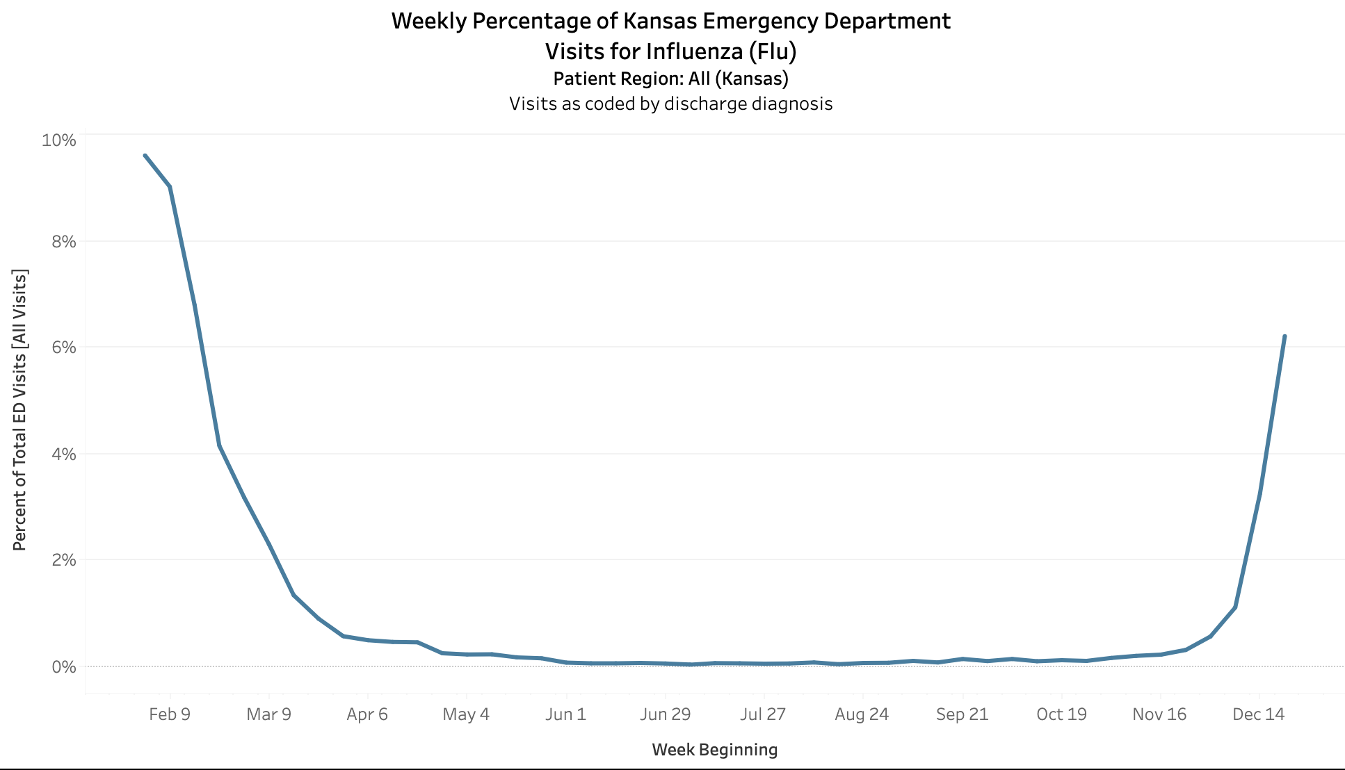Still climbing. Flu is very high in Illinois, accounting for 8.2% of ED visits and 5.3% of hospitalizations. It is steeply rising in Kansas, doubling this past week to 6.2% of ED visits. There was a sharp increase in hospitalizations in Ohio this past week, though overall flu hospitalizations remain fairly low.