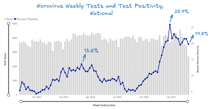 Norovirus spread continues apace. Rates remain very, very high, with test positivity at 19.8% this past week. The Midwest and Northeast are being hit particularly hard right now.