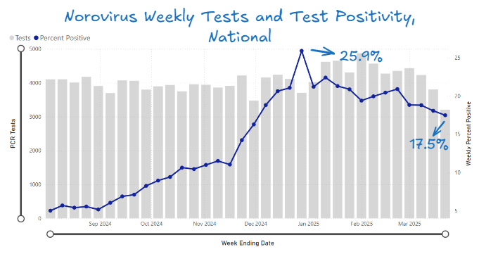 Norovirus tends to persist well into the spring, so while relief is getting closer, it is likely that we still have several more weeks of elevated rates ahead of us.