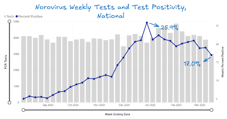 Some slightly good news - norovirus activity dipped a bit in the past couple weeks, down to 17% test positivity. This is still very high, but it is lower than it has been December. Rates are lowest in the West, and the South and Midwest are roughly tied for first place.
