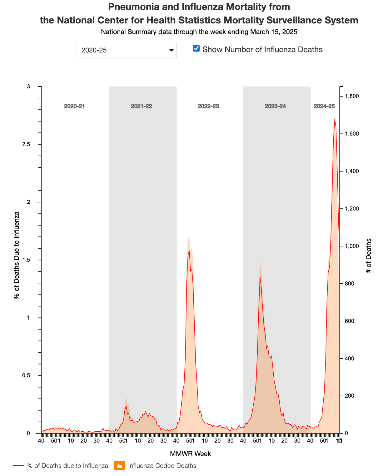 There's no question that this was a remarkable flu season. Deaths from pneumonia and influenza far exceeded the last few seasons (as shown below). Hospitalizations for influenza were high as well. In some ways, we are fortunate that we had a quiet Covid-19 winter season, because the combined burden on the healthcare system could have been even more substantial.