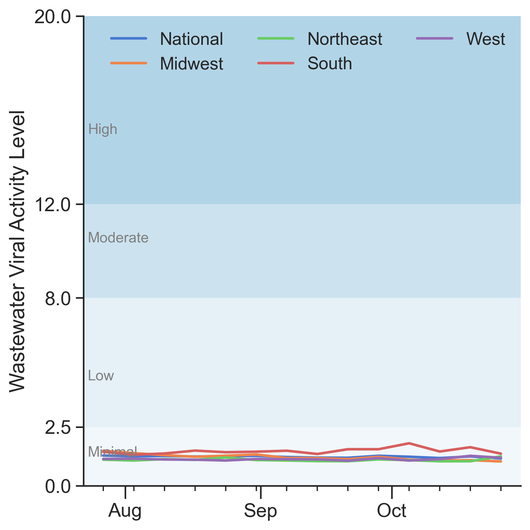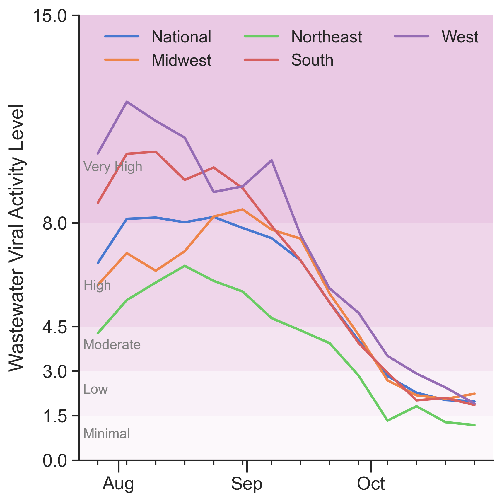 The lull in Covid-19 cases continues. Wastewater activity is low nationally, with all four regions of the country reporting minimal or low activity. The Midwest has seen a slight rebound lately, but it’s too soon to call it a trend, as numbers do jump around.