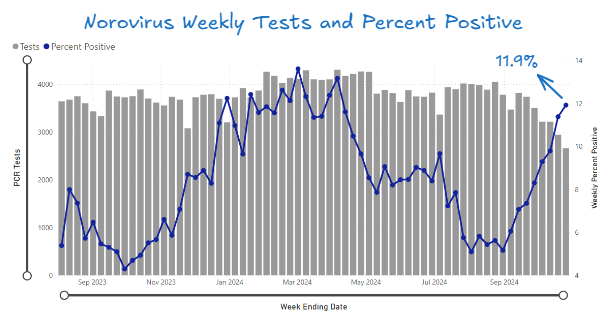 Norovirus is high and increasing right now. Nationally, test positivity is at nearly 12%. To put this in context, the peak last year was 13.6%. Rates are particularly high in the Southern region.