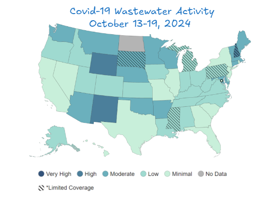 Covid-19 is quiet right now. Wastewater activity is low nationally, and in every region, activity is either low or minimal.
