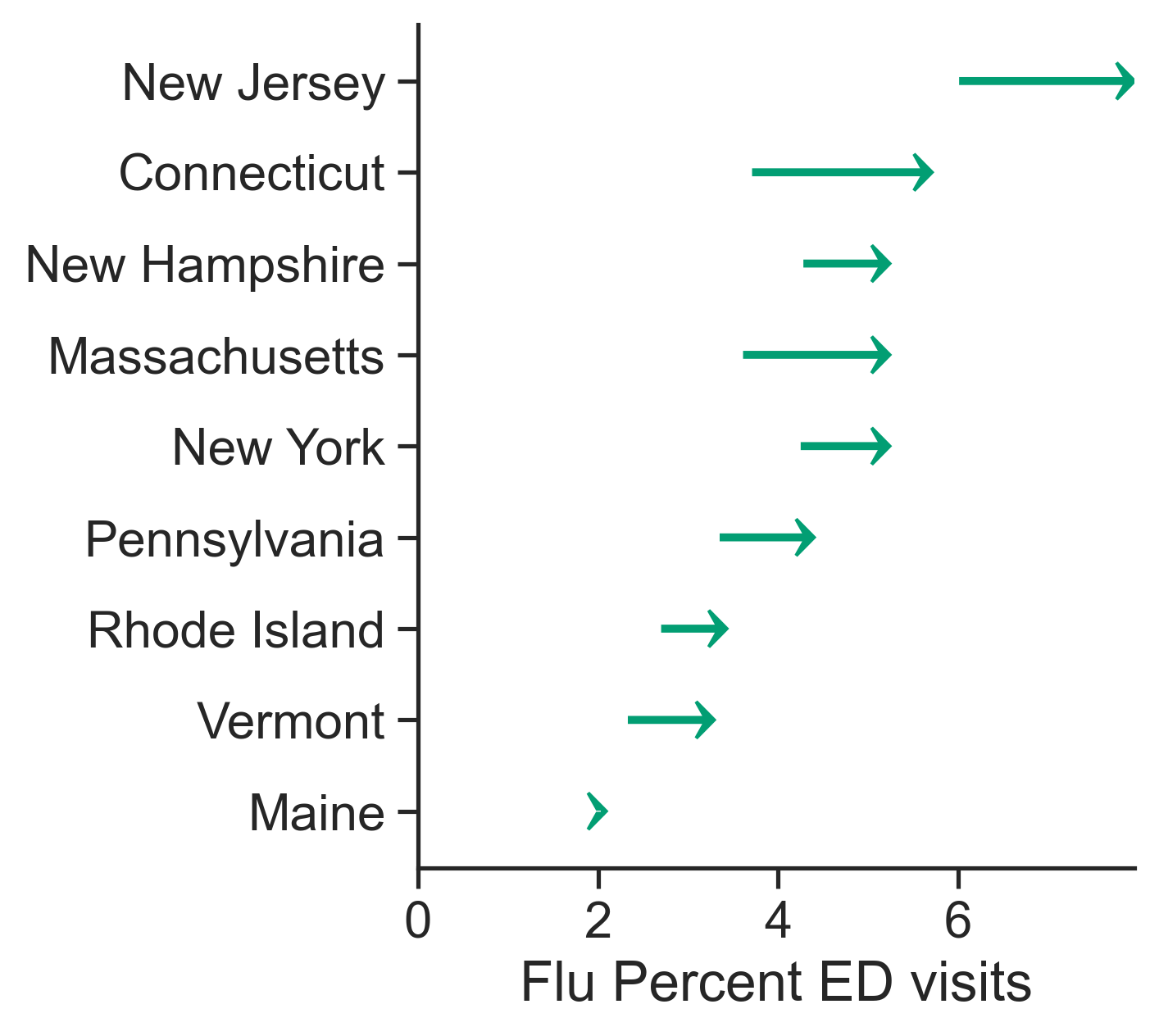 New Hampshire reports ED visits at 5.2% (up from 4.3%). Vermont shows moderate activity with ED visits at 3.3% (up from 2.4%), with ILI visits at 2.8%. Maine maintains the region's lowest ED visit rate at 2.1% (virtually unchanged from 2.1%), with ILI visits at 3.7%.