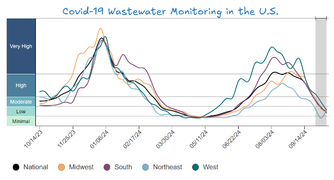 Things are calm across most of the West. Wastewater activity is low, ED visits are minimal and declining, and hospitalizations are decreasing. Wastewater activity is nearly 5x lower than it was during this summer's peak.