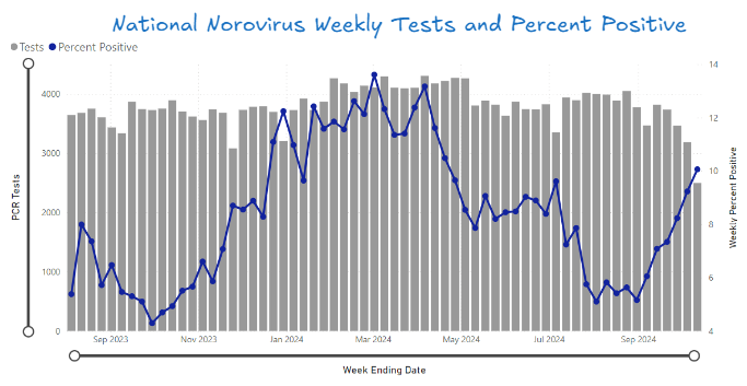 In the West, norovirus test positivity, which had been hovering between ~6-8% for the past couple months, increased this past week to 9.4%. In the Midwest, test positivity has increased to 8%, up from ~5% in August. Norovirus remains low in the Northeast at 1.7% test positivity.