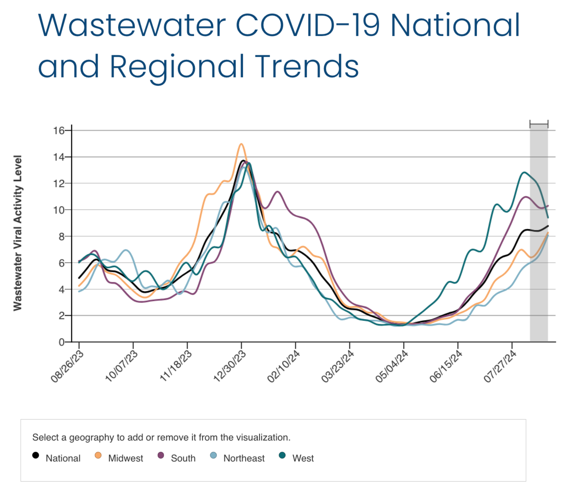 Covid-19 activity is still very high, with all regions seeing elevated transmission. The South has surpassed the West as the region with the highest wastewater concentration, and the Midwest and Northeast are continuing to see increasing levels.