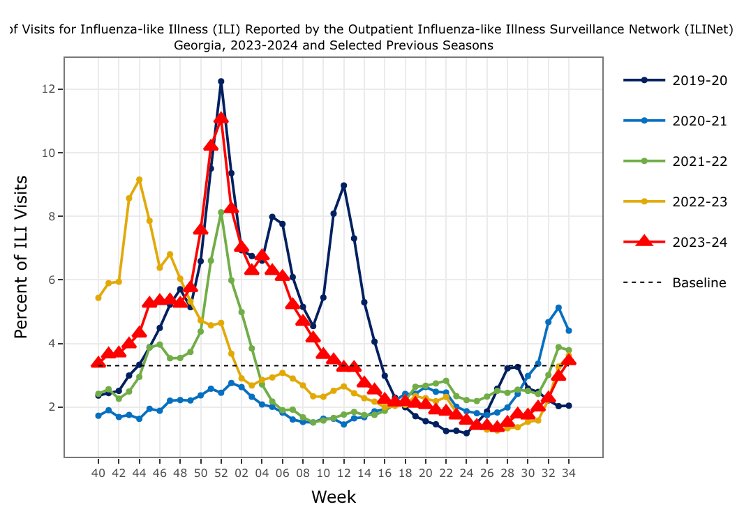 Both Georgia and Washington DC have transitioned from “minimal” to “low” ILI activity. In Georgia, ILI accounted for 3.4% of all outpatient visits last week, surpassing the regional baseline of 3.3% that marks the beginning of flu season. This increase was primarily concentrated among those aged 5-24, followed by 25-49.