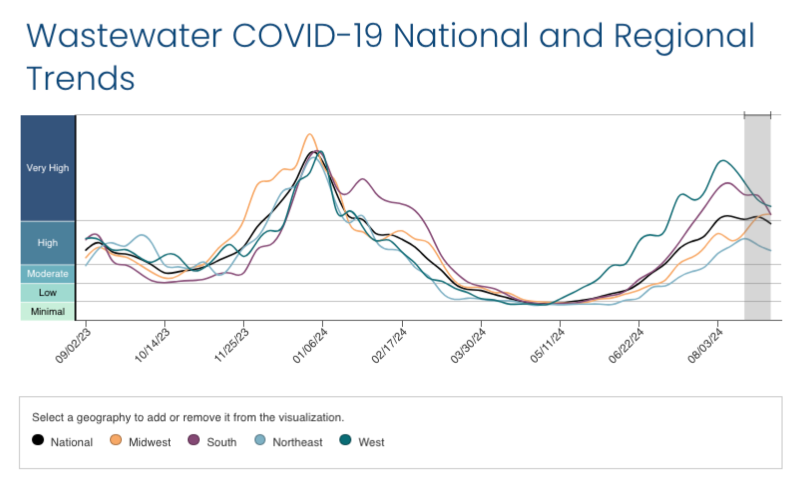 Wastewater activity dipped slightly nationally, from ‘very high’ to ‘high’ activity. Concentration remains highest in the West and the South, though both of these regions are improving.