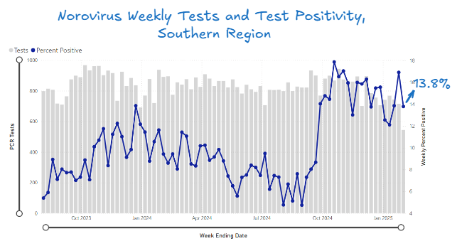 Norovirus remains stubbornly high. Test positivity decreased this past week to 13.8%. Rates are oscillating a bit right now: the last couple months, rates have oscillated in a band between ~12-18 test positivity. As such, despite the decrease this week, I expect it to go back up again.