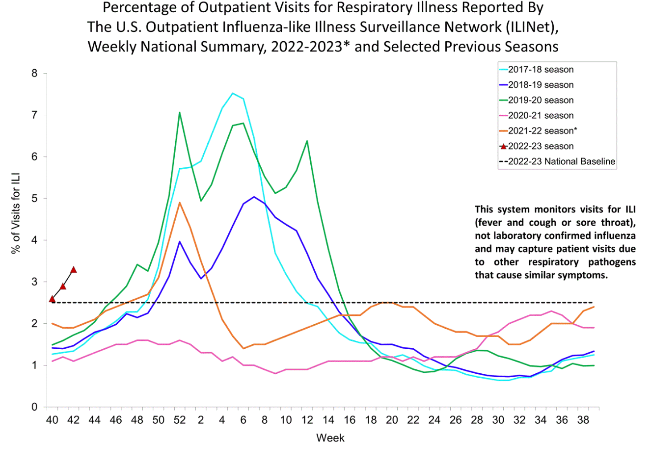Influenza season is coming in like a lion. The proportion of outpatient visits that are for influenza like illness (ILI) is at a level not usually seen until December or later. Twelve jurisdictions are already reporting high or very high levels of ILI activity. Children ages 0-4 continue to experience a high burden of ILI; some 1 in 7 outpatient visits in that age group are for ILI symptoms like fever, cough and sore throat.