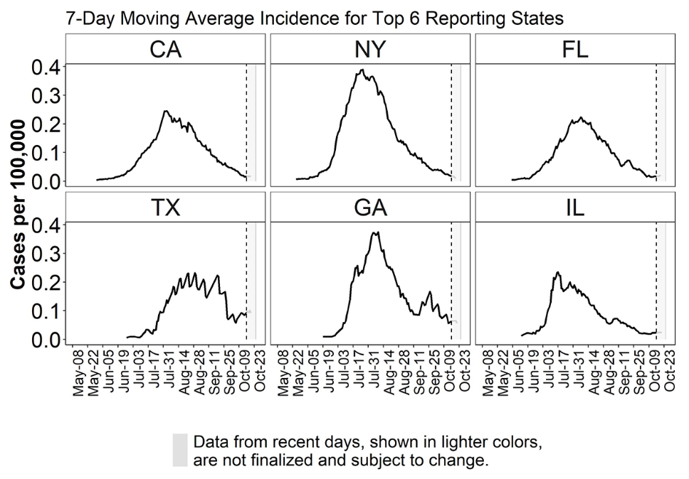 There are now 27,881 reported cases of monkeypox in the U.S.; I never thought I would see a poxvirus outbreak of this size. The good news is that the number of new cases has declined dramatically in most jurisdictions, from a daily average high of 446 nationwide to an average of 30 this week. It’s worth noting that not all jurisdictions are improving right now. Texas is seeing a rebound, and Illinois has plateaued (albeit at a very low level).