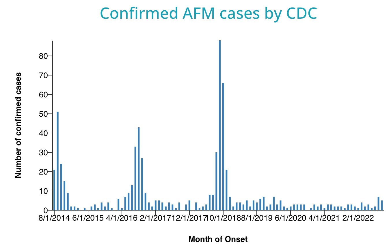 There have been 27 reported cases of acute flaccid myelitis (AFM) reported to CDC this year. AFM is a polio-like paralytic illness that is thought to be a rare complication of enterovirus-D68 infection. Earlier this year, CDC sent out a Health Alert Network notice warning of a possible surge in AFM cases this fall. Thankfully, that has not come to pass, at least not to the same degree as the 2014, 2016 and 2018 seasons.