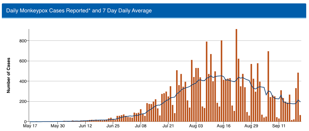 The U.S. monkeypox outbreak has slowed markedly, down from a daily average of 454 reported cases in August to around 200 daily cases now. This good news is attributable to some combination of robust communication and education campaigns, case-based interventions like contact tracing, isolation and quarantine, and the vaccination of more than 500,000 people at risk.