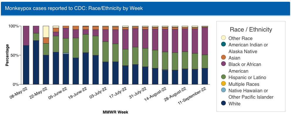 For demographic trends, concerns about the virus spreading in schools or daycares have not been realized. CDC has received reports of just 35 cases in children under the age of 16. Adult men continue to constitute the vast majority of cases, over 96%. However, the racial disparities observed early in the outbreak persist. The week of September 11, Black men made up 47% of cases, and Hispanic men made up 23% of cases. In contrast, 9% and 26% of vaccine doses have gone to Black and Hispanic people (mostly men), respectively.