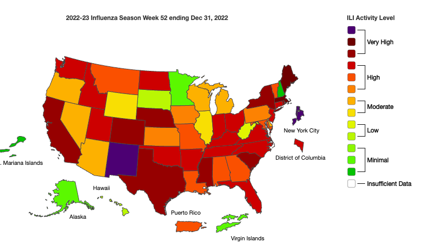 Thirty-nine jurisdictions are now classified as having high or very high levels of ILI activity, down from 44 jurisdictions last week. ILI activity is highest in Maine, Massachusetts, New Mexico, and New York City. I did notice some rebound in state and local data, including increases in some respiratory disease indicators in Chicago, Texas and Alabama, so I’ll be keeping eye on that.