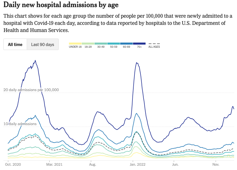 COVID-19 hospitalization have been increasing steadily since November. As of January 6, 48,000 were hospitalized with COVID-19, the highest it has been since February of 2021. As in previous waves, older adults remain most at risk of hospitalization, especially people over the age of 70.