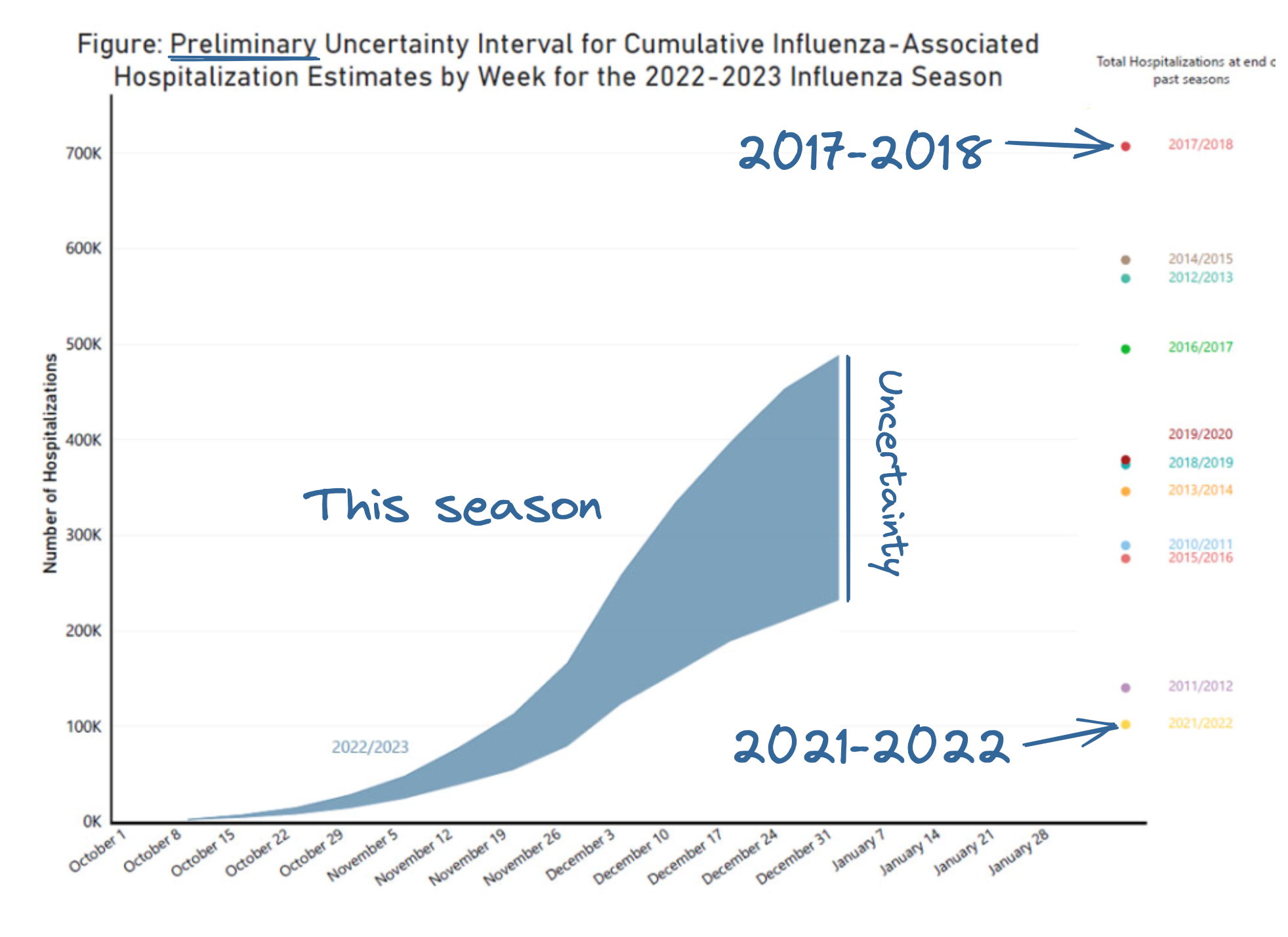 The number of people hospitalized with influenza in the week ending Dec 31 has dropped to under 19,000, down from a high of 26,000. However, the number of hospitals submitting data has also dipped in recent weeks, so I’m taking that assessment with a grain of salt.