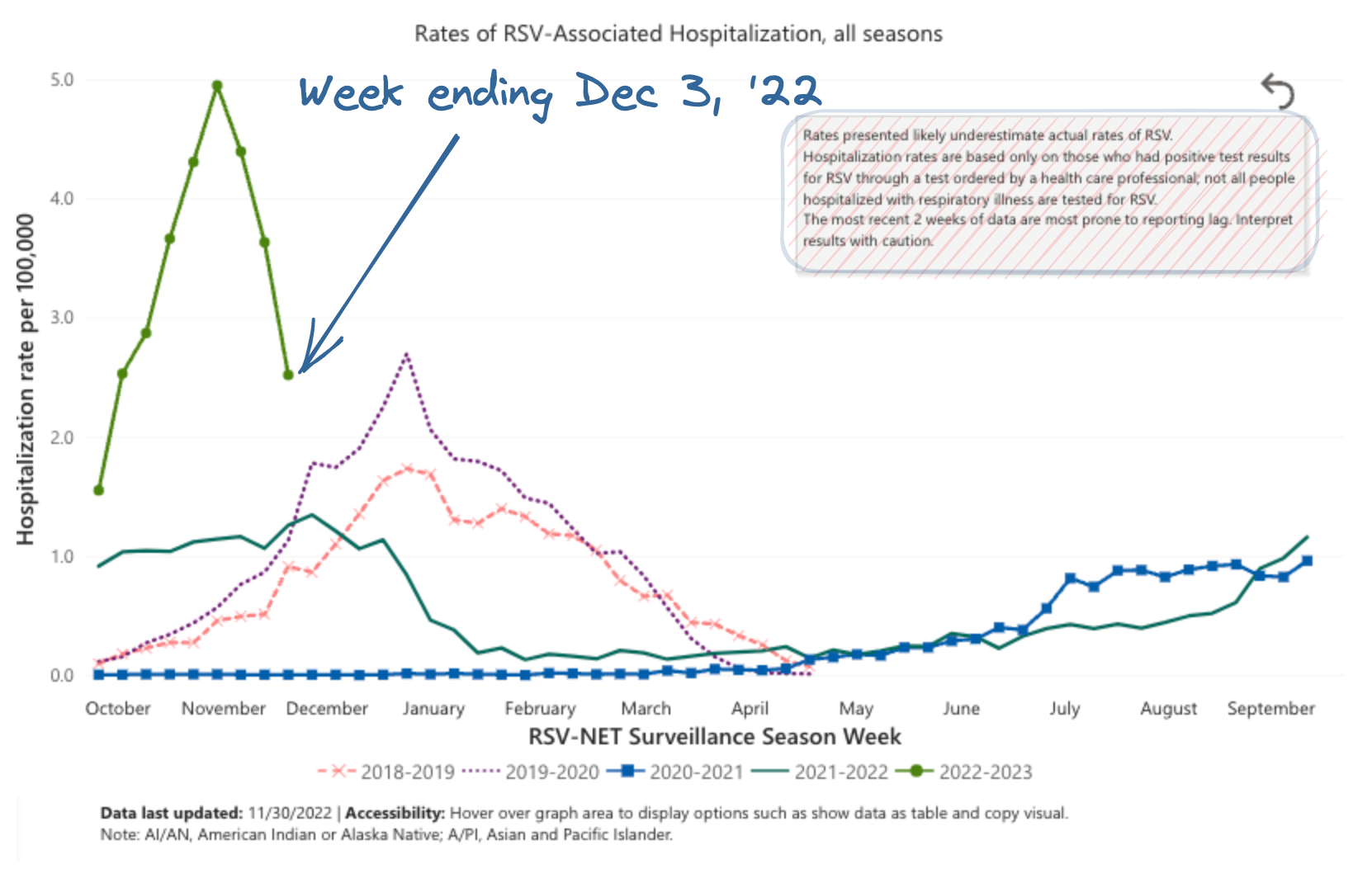 Although RSV activity remains high, the wave that was overwhelming children’s hospitals this past fall has dissipated somewhat. Throughout October and November, hospitalization rates due to RSV were extremely high, but in recent weeks they have dropped significantly. Although data on RSV is subject to revision, the current numbers suggest a genuine decrease.