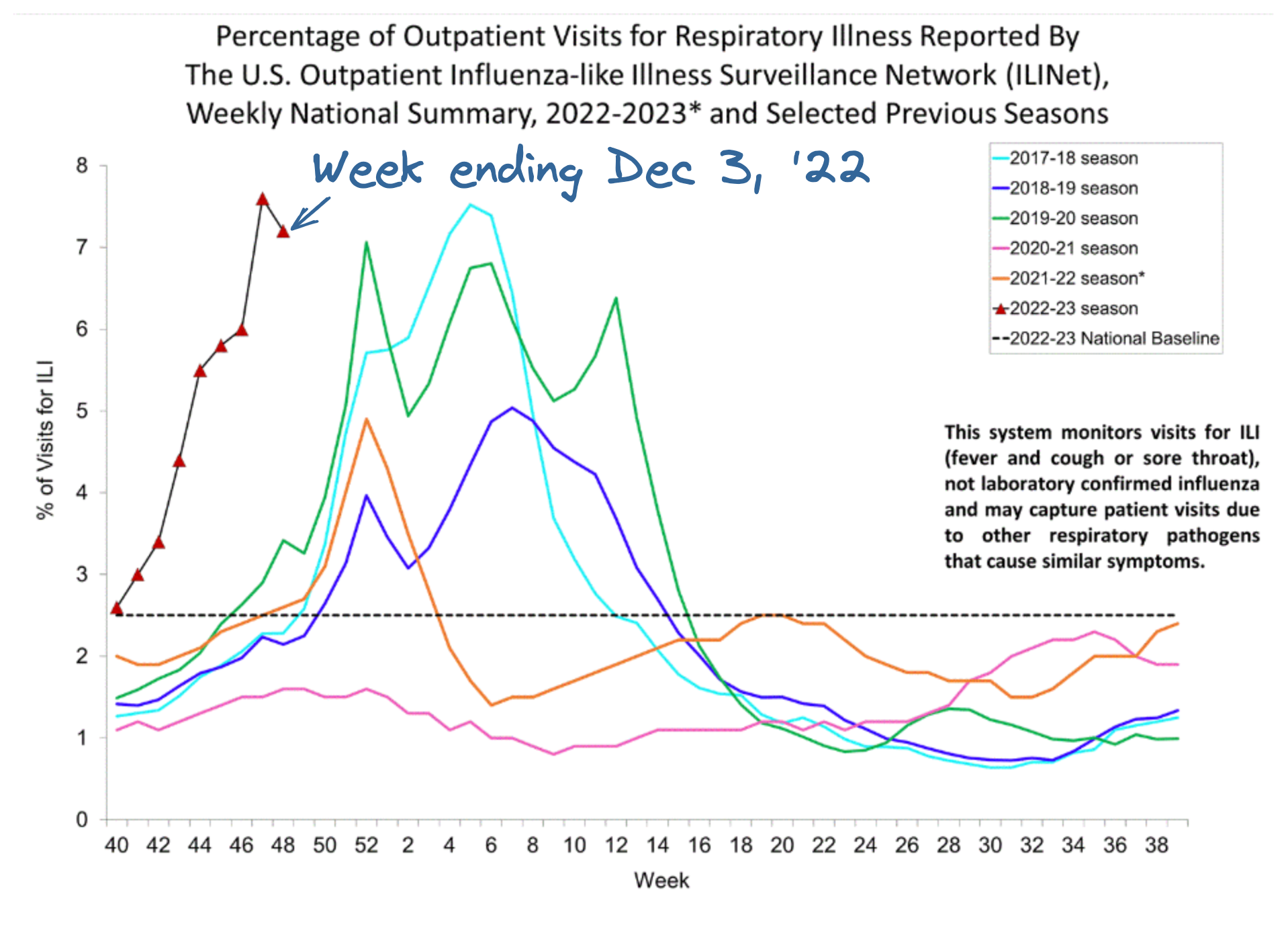 Levels of influenza like illness (ILI) activity remain high as we head into the winter holidays. According to data from the week ending December 3, one in thirteen visits to the doctor's office were linked to ILI (which includes both influenza and other infections that cause fever, cough or sore throat.) This is a slight decrease from the previous week, but is still much higher than normal for this time of year.