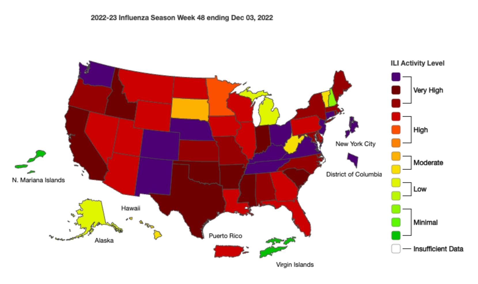 As in previous weeks, almost the whole country is reporting high or very high levels of ILI activity. While much of the Southeast has peaked, activity is still considered high, and parts of the Mid-Atlantic and West are seeing an increase.