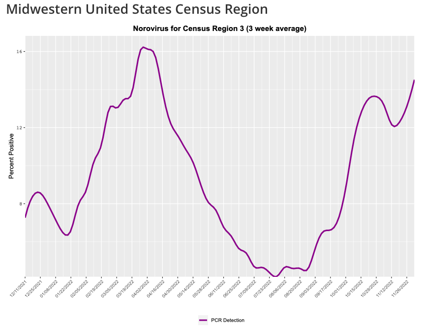 Although surveillance for the pathogens that cause vomiting and diarrhea is not as robust as I would like, there appears to be an increase in norovirus, which causes the classic "stomach bug". This is most evident in the midwestern region of the country, where the percentage of tests that are positive for norovirus is at 14%, up from 4-8% over the summer months.
